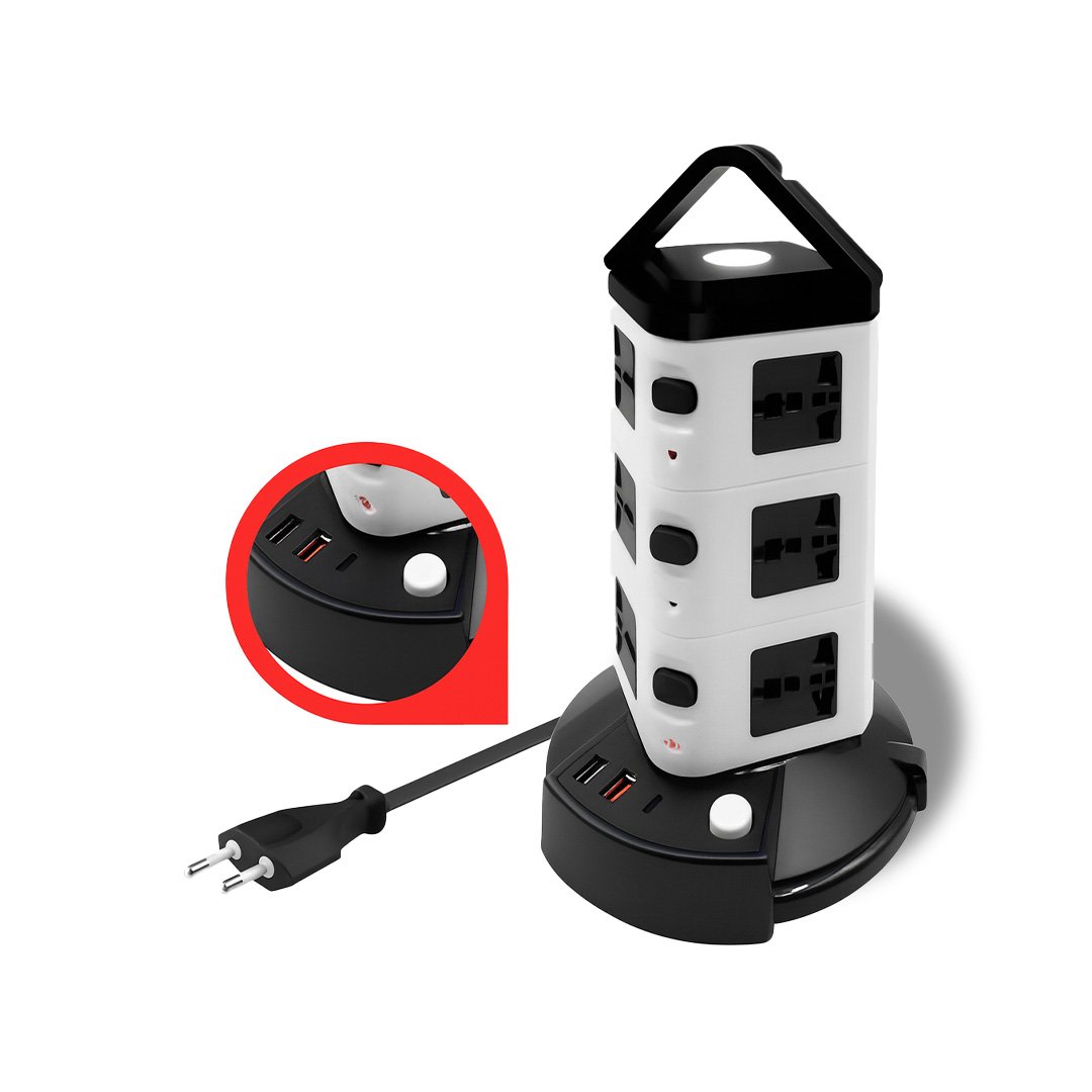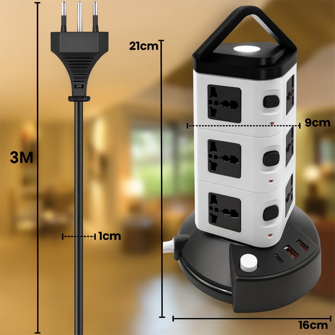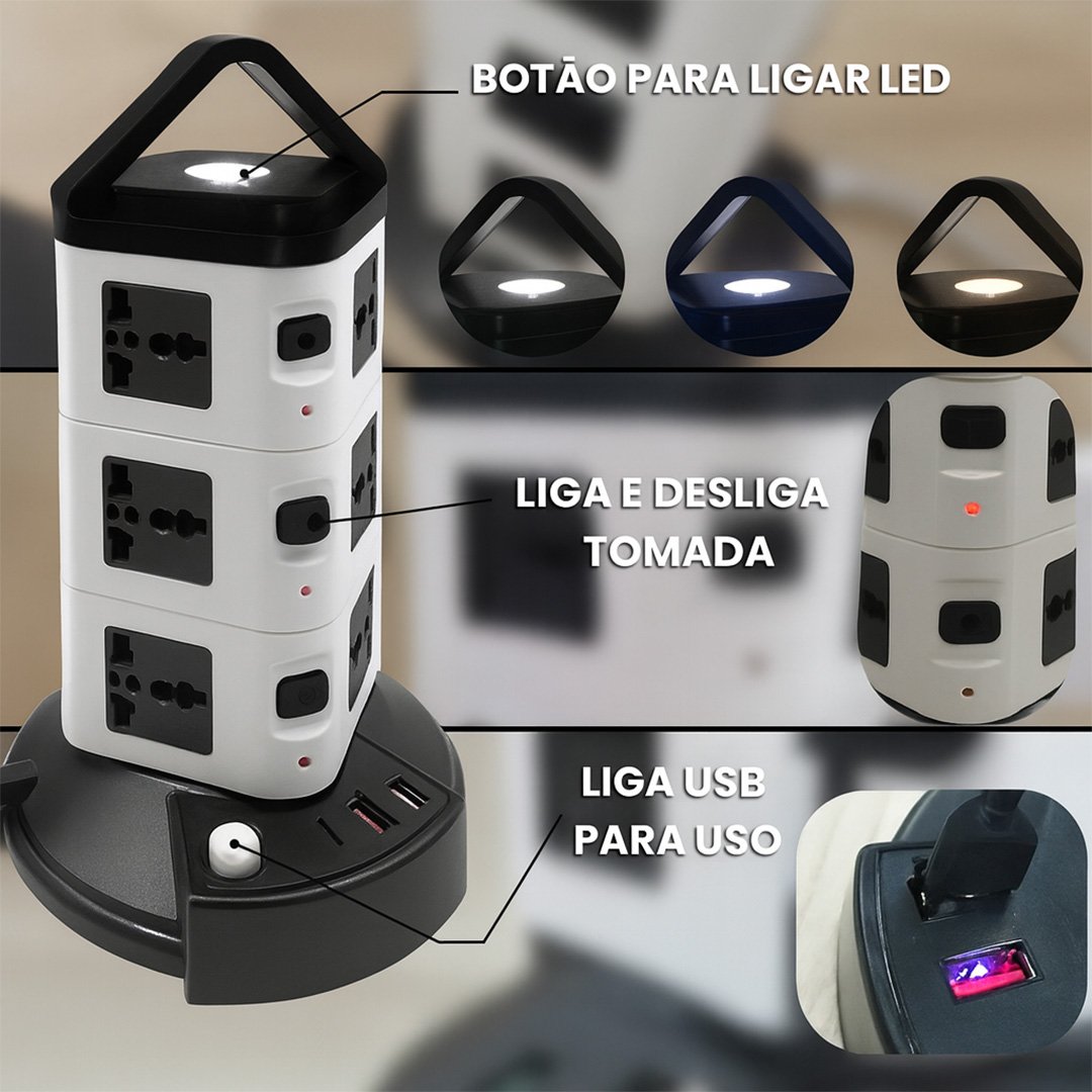 Torre de 3 ANDARES – Tomadas Elétrica com 12 Entradas Universais + 2 Portas USB + 1 Porta Tipo C Bivolt com design moderno, fácil de usar e ideal para o dia a dia.