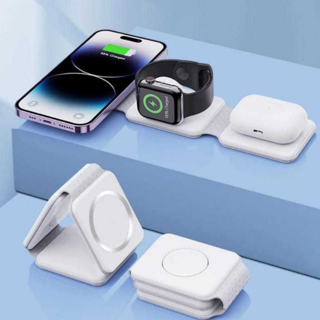 CARREGADOR PORTÁTIL DOBRÁVEL Magsafe 3 em 1- Branco com design moderno, fácil de usar e ideal para o dia a dia.